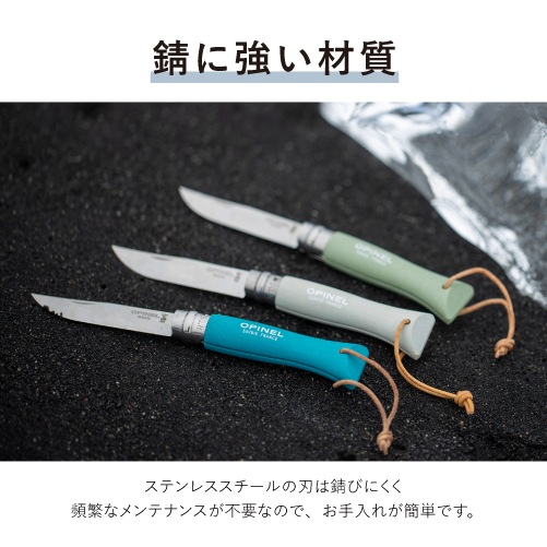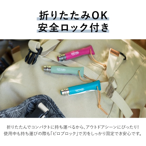 使用するときも、折りたたんだときも、刃を固定できるビロブロック®付き。OPINEL独自の安全ロック機構であるビロブロック®は、シンプルな構造でありながらロックの確実性が高いことが特徴です。