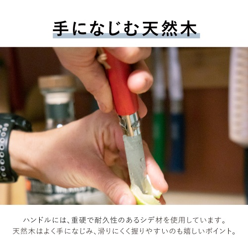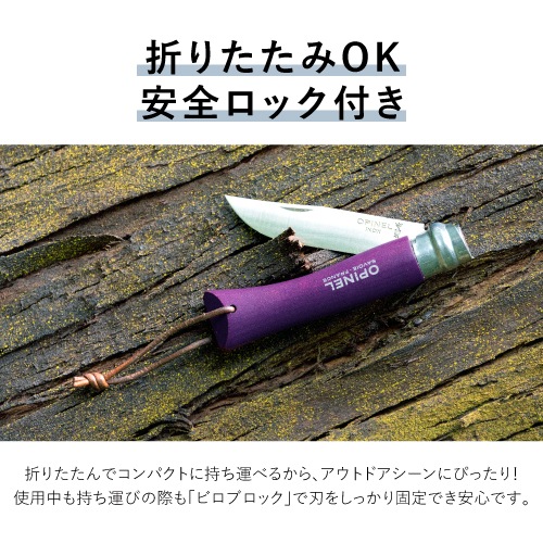 使用するときも、折りたたんだときも、刃を固定できるビロブロック®付き。OPINEL独自の安全ロック機構であるビロブロック®は、シンプルな構造でありながらロックの確実性が高いことが特徴です。