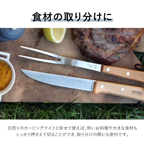肉料理や熱い食材をしっかりと押さえることができるカービングフォークです。別売のカービングナイフとセットで使うことで、ローストビーフなどの大きな食材もより安定して切り分けることができます。