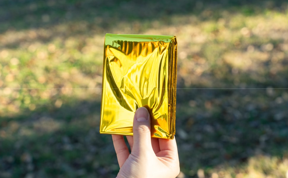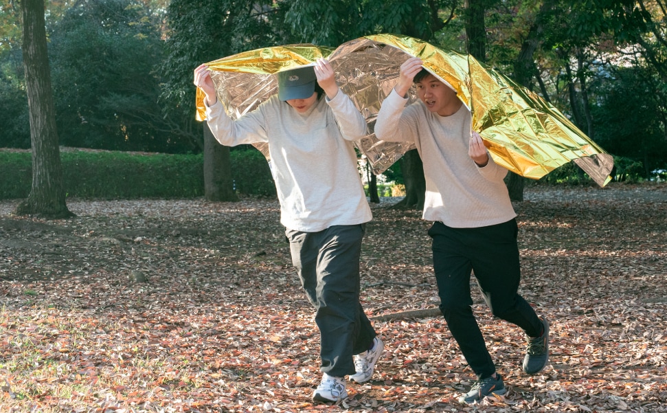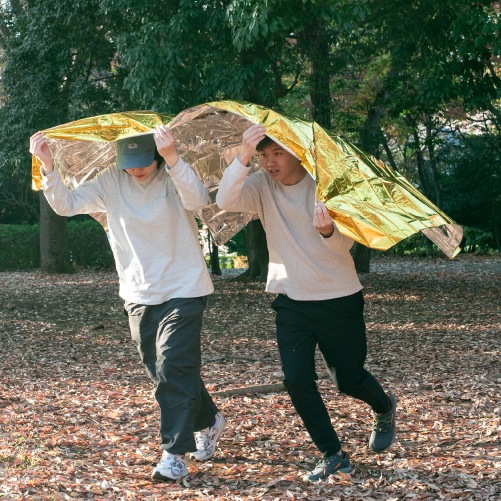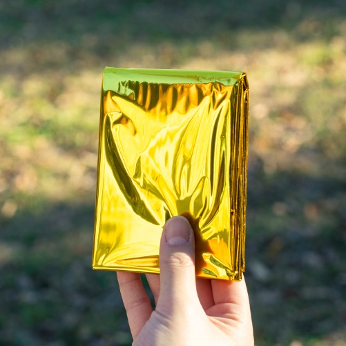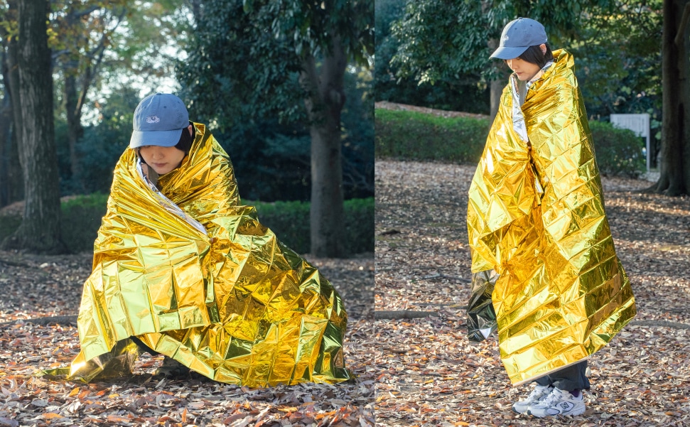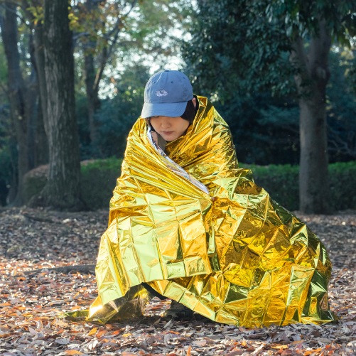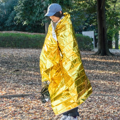 急変する気温の変化や、雨、風から身体を守るための緊急用シートです。熱を吸収する金色と、熱を反射する銀色の性質を応用し、断熱効果を高めることができます。