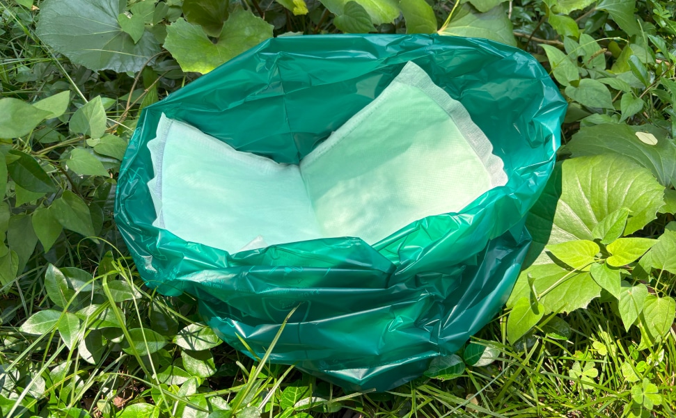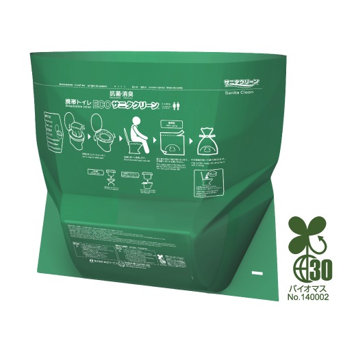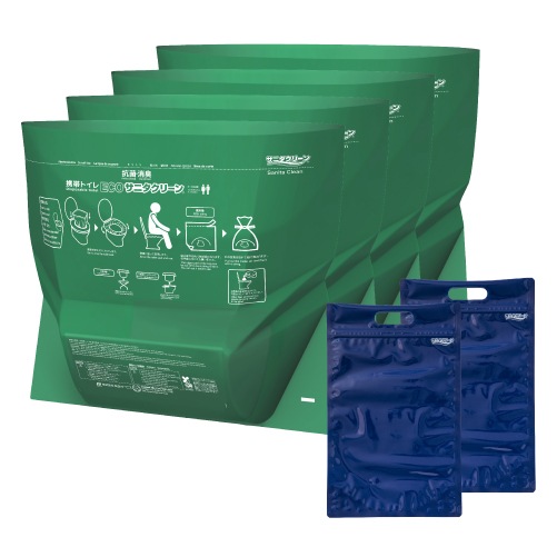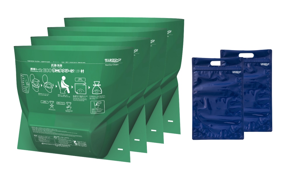 大気中の二酸化炭素が増加しない、環境に配慮した携帯トイレのECOサニタクリーン4枚と、高密閉チャック袋2枚がセットに。