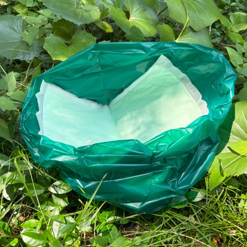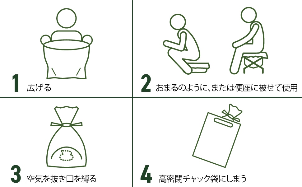 広げたら、おまるのように、または便座に被せて使用します。使い終わったら空気を抜いて口を縛り、高密閉チャック袋に入れて完了です。地域のルールに従って処分してください。