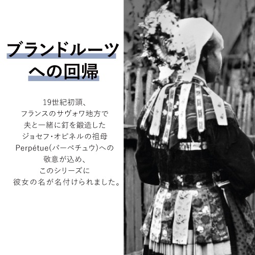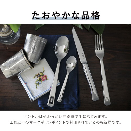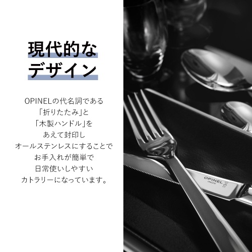 世界中の名だたるブランドのプロダクトデザインを手掛けるデザインチーム「BIG GAME」と共同開発したカトラリーシリーズ「Perpétue(パーペチュウ)」のコーヒースプーンです。OPINELのナチュラルなイメージとは一線を画すオールステンレスの現代的な雰囲気で、食卓を華やかにランクアップしてくれます。