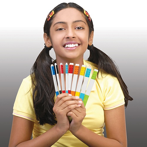 赤、オレンジ、黄色、黄緑、緑、水色、青、ラベンダー、紫、黒のマーカー10本セット。マーカー上部のブロックは同シリーズ製品につけたり、レゴブロックと組み合わせることができます。