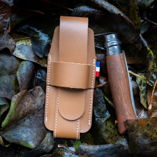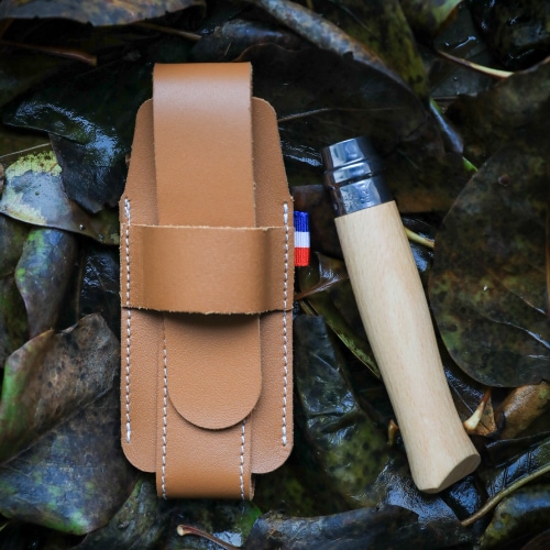 OPINELの折りたたみナイフNo.07/08/09、Effilé スリムナイフ No.08に適合したナイフケース。イタリアのなめし革工場から最高級のフォーンレザーを仕入れ、フランスのサヴォワで作られています。スイスのデザインスタジオ「BIG-GAME」と共同開発した、Collection Franceシリーズのひとつです。