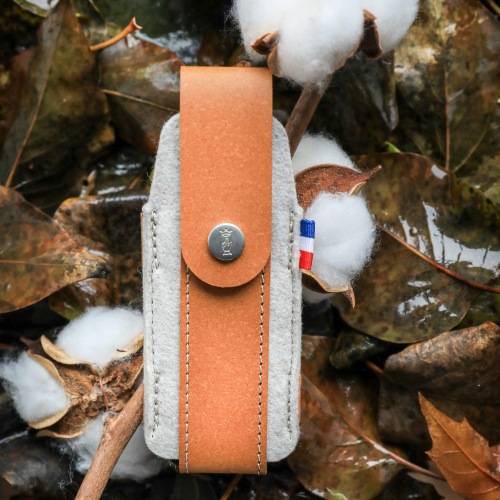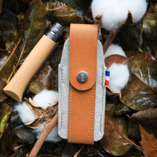 OPINELの折りたたみナイフNo.07/08/09、Effilé スリムナイフ No.08/10に適合したナイフケース。廃革繊維を加工したリサイクルレザーと、ペットボトルをリサイクルしたR-PETフェルトを組み合わせて作られています。スイスのデザインスタジオ「BIG-GAME」と共同開発した、Collection Franceシリーズのひとつです。