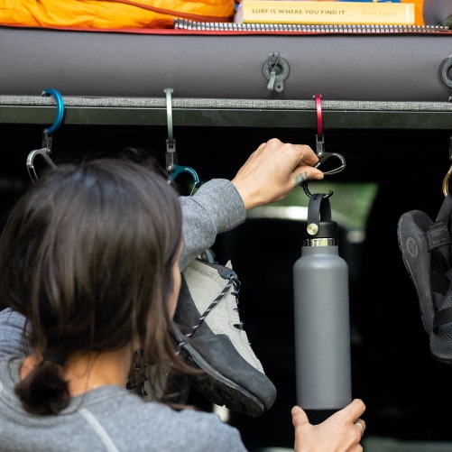 フックにもカラビナにもなるので、外出時の荷物置き場に困りません。複数の荷物もまとめて掛けられるから、手持ちが多い時にも活躍します。