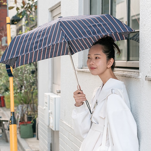 ワンタッチ開閉の軽量自動開閉傘です。ハンドルのボタンを押すと自動的に開閉するため、雨の日の乗り物の乗降時などに便利。すべての商品が安全機能付きで、シャフトが跳ね返らない構造なので安心してお使いいただけます。UVカット率は90%以上で、雨の日だけでなく日差しの強い日にも◎つゆさきは丸い形状のセーフティーチップを採用しています。