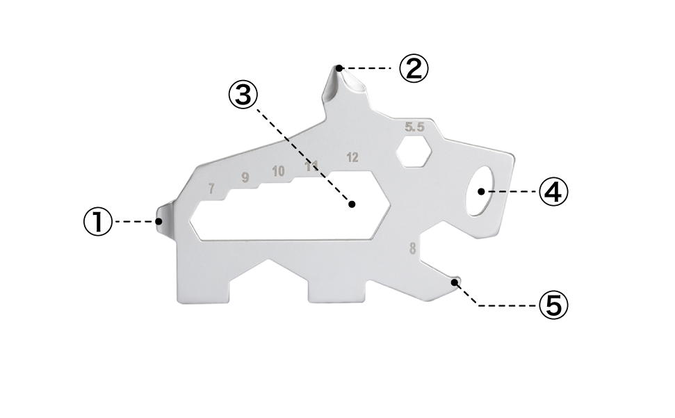 ワイルドボアー(イノシシ)のかたちのマルチツールです。栓抜きやレンチ、ドライバーなど便利な機能が盛りだくさん。キーホルダーやポーチに付けて携帯できます。