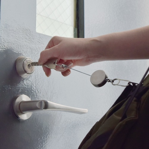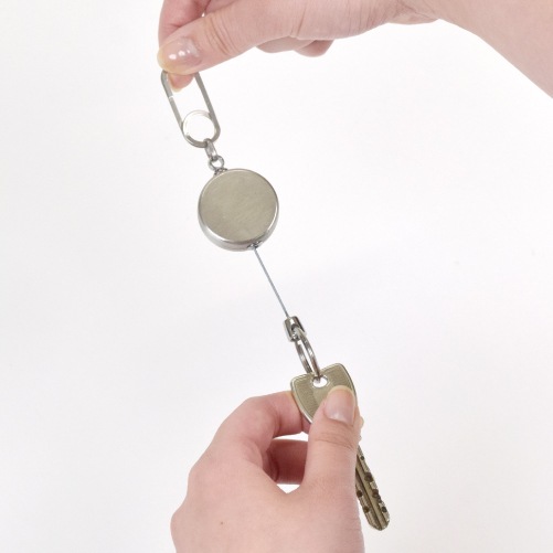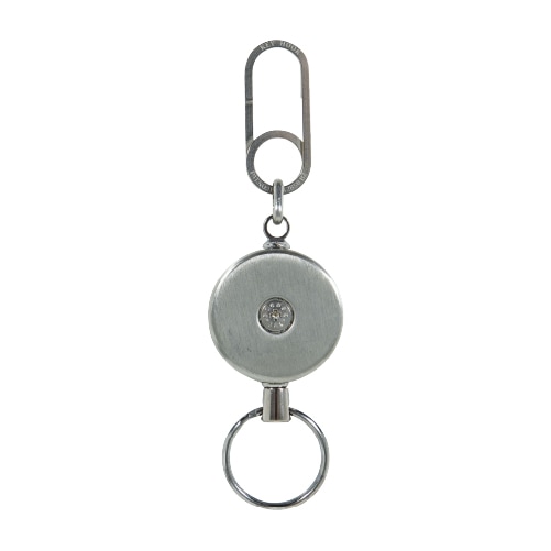 ステンレス製のリールキーホルダーです。先端のクリップは、軽くつまむだけで簡単に開閉可能。表裏同一のすっきりとしたデザインです。