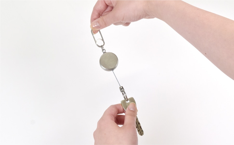 ステンレス製のリールキーホルダーです。コードは最大約67.5cmまで引き伸ばすことができ、鍵やツールを付けたままスムーズに使用できます。先端のクリップは、軽くつまむだけで簡単に開閉可能。表裏同一のすっきりとしたデザインです。
