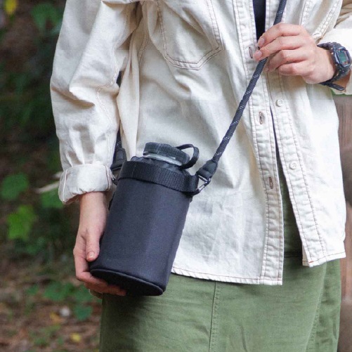 取り外しのできるストラップ付きのハイマウントオリジナルボトルケースです。ストラップには反射材が編み込まれており、視認性と利便性に優れています。ナルゲンボトルの広口1.0L、細口1.0Lに対応しています。