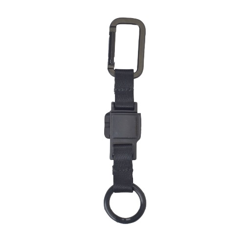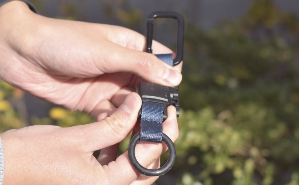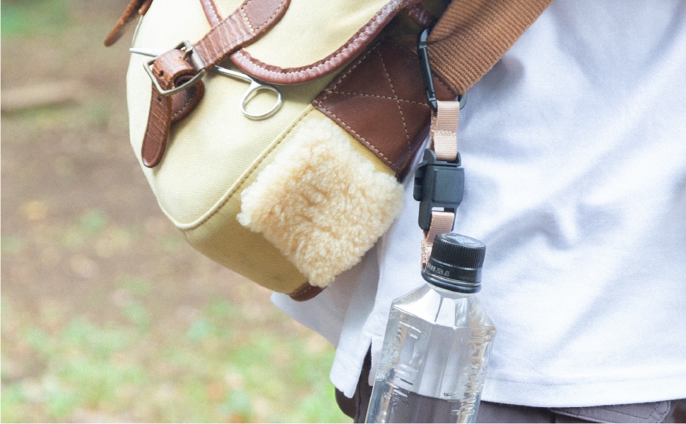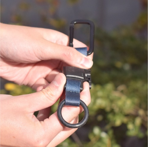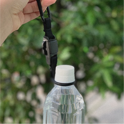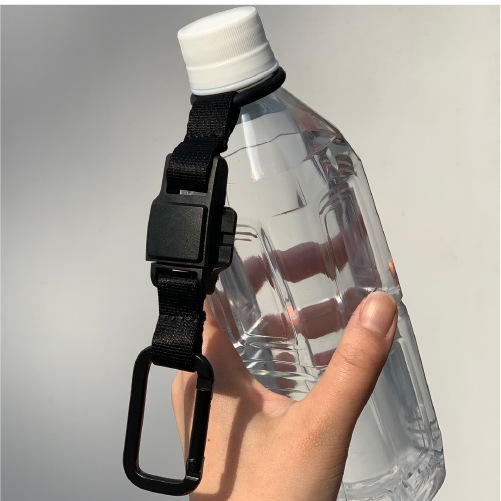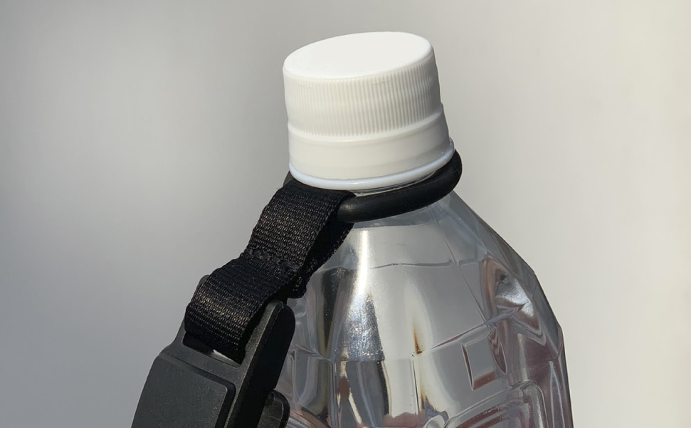 先端の柔らかな丸いリングは、ペットボトルの飲み口に合うように作られています。リングをボトルに装着して吊り下げ、ショルダーハーネスなど、素早くアクセスできる場所にカラビナを取り付ければ、バックを背負ったまま、水分補給をすることができます。
