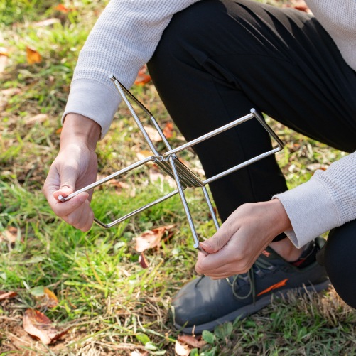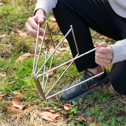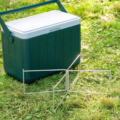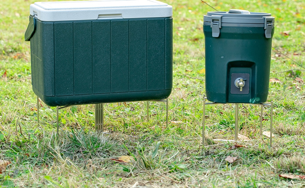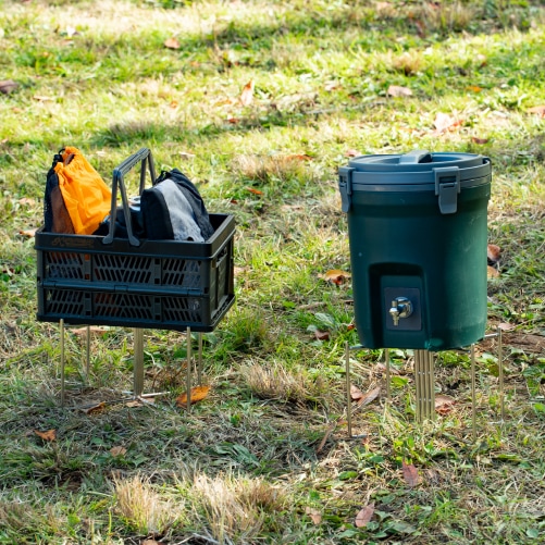 キャンプやアウトドアで、置き場に困りがちなジャグやクーラーボックスに便利なスタンドです。使うときはサッと広げてすぐ設置、使い終わったら折りたたんでケースに収納できる持ち運びやすい仕様。地面に直接置かないため底が汚れにくく、清潔に使えます。Sサイズは小さめのウォータージャグや小型クーラーボックス、コンテナに最適なコンパクトサイズ。Lサイズは大容量ウォータージャグや大型クーラーボックス、調理用コンテナに対応した大きめサイズです。