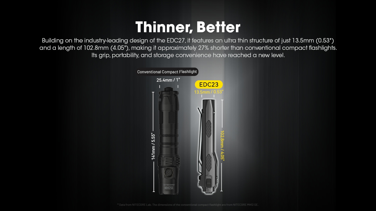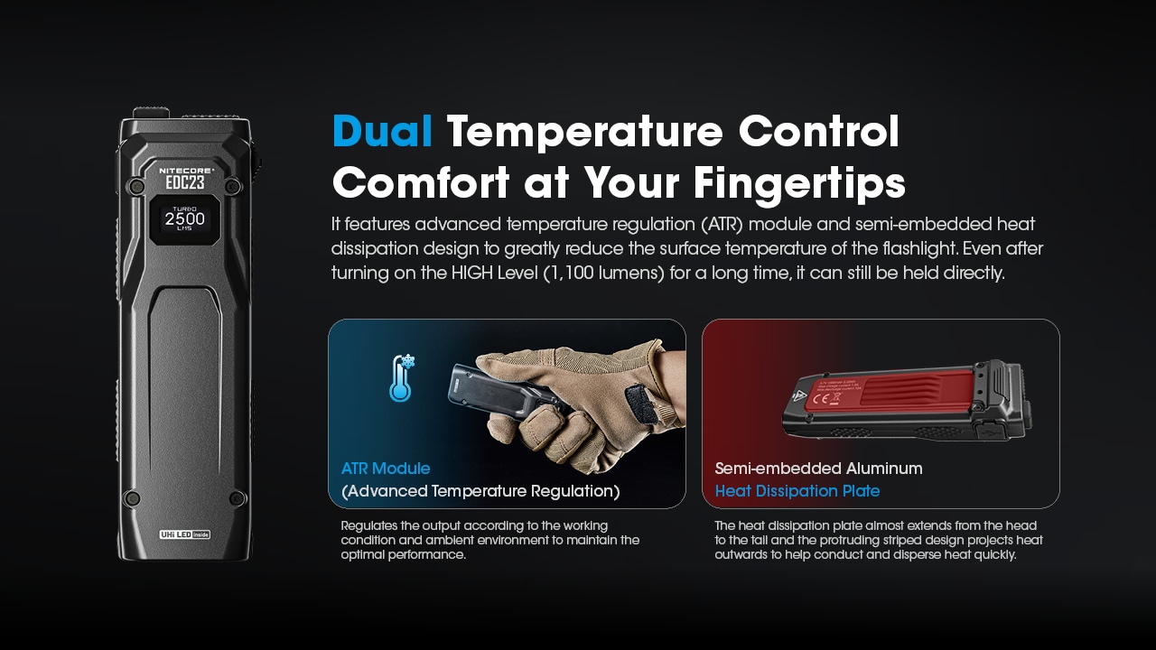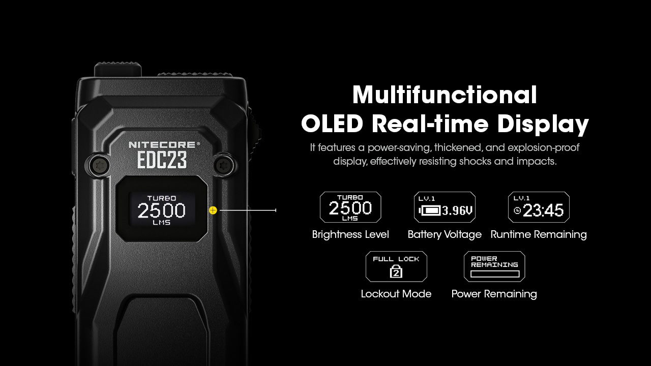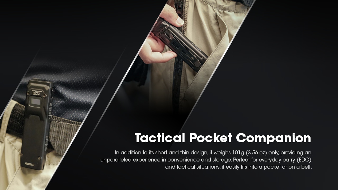 NITECORE EDC23は、UHi 25 LEDを2基搭載した超薄型タクティカルサーチライト。最大2,500ルーメンの高出力を実現し、最大20,720cdのピークビーム強度と最長280mの照射距離で、遠距離まで確実に照らします。