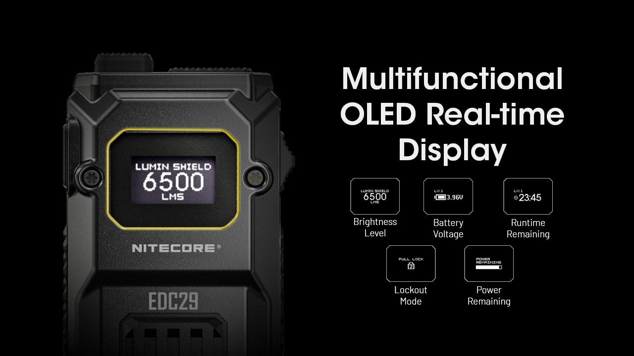 4段階の明るさ調整に加え、ルミンシールド™、サーチモード、ストロボモードを搭載し、ワンボタンで即時アクセスが可能。OLEDディスプレイにより、明るさやルーメン、バッテリー電圧、残り駆動時間をリアルタイムで確認できます。