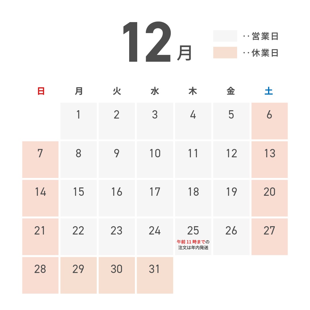 ※休業日は、商品の発送、お問い合わせ対応はお休みさせていただきます。