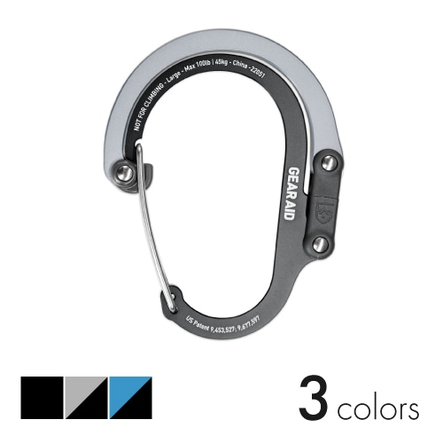 定番人気のミディアムサイズ。汎用性が高く、さまざまなシーンで便利に使えます。カラビナとしての使用はもちろん、開けば360度回転するフックが現れS字フックや回転フック、バッグハンガーに早変わり。フックの先端はグリップ性の高い素材を使用しているので、荷物を掛けやすいのもポイント。材質は航空機グレードのアルミニウム合金製で耐久性も抜群です。
